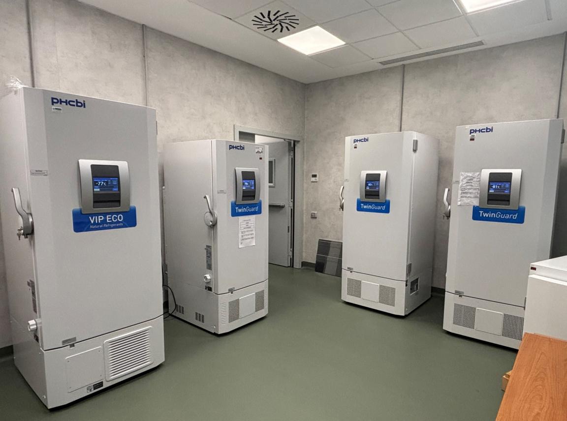 Stoccaggio di campioni biologici in ultracongelatori -80°C e dewar di azoto liquido.